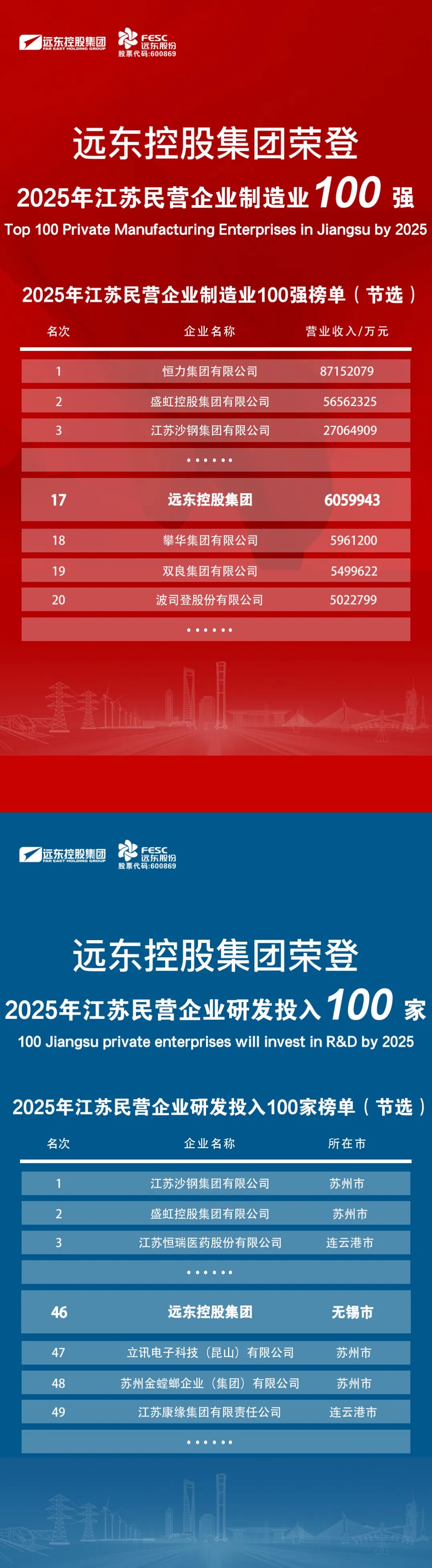 10月12日,2025江蘇民營企業(yè)百強(qiáng)發(fā)布活動(dòng)在徐州舉行。省委常委、省委統(tǒng)戰(zhàn)部部長胡廣杰出席活動(dòng)并講話,省委統(tǒng)戰(zhàn)部副部長、省工商聯(lián)黨組書記劉軍主持活動(dòng)。省發(fā)改委、省科技廳、省工信廳,省工商聯(lián)有關(guān)領(lǐng)導(dǎo),及各設(shè)區(qū)市工商聯(lián)負(fù)責(zé)領(lǐng)導(dǎo),百強(qiáng)民營企業(yè)代表等參加活動(dòng)。會(huì)上,省工商聯(lián)主席劉聰發(fā)布江蘇民營企業(yè)百強(qiáng)系列榜單,遠(yuǎn)東分別榮登2025江蘇民營企業(yè)200強(qiáng)第22位、2025江蘇民營制造業(yè)100強(qiáng)第17位以及2025江蘇民營企業(yè)研發(fā)投入100家第46位!